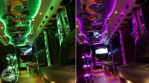 3 dance poles Huge Dance floor areas Custom Limo Style seating AUX/Bluetooth connectivity 10 speakers 4 subwoofers DJ Laser lights Strobes Fog Machines Tv/DVD players 45 seats 50 Person capacity