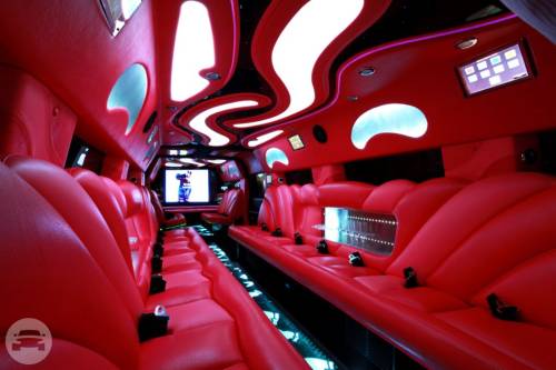 12.3 metres long Weighing over 9.5 tonnes 24 inch rims on all 8 wheels Seating an incredible 24 people For the technically inclined this is an incredible engineering feat, with 8 wheels, rock ram steering, jet style gull wing doors, electric steps, air bag suspension and we have even raised the roof. For the party people we have installed a fully integrated sound system, a 50 inch screen, a 30 inch screen and two 10 inch screens, disco floor, laser lighting, smoke machine, touch pad controls… and of course 6 bars! Features include: “Jet” style Gull Wing Doors with 10 inch flat screens inserted Electric steps Raised ceiling so you can stand up in the vehicle Disco floor and ceiling Disco Bar tops Laser lighting 4000W stereo system, DVD, CD and IPOD ready. Smoke machines 1 x 50 inch LCD screen at the rear 1 x 30 inch LCD screen at the front 2 main bar areas front and rear 4 supplimentary bar areas between seats