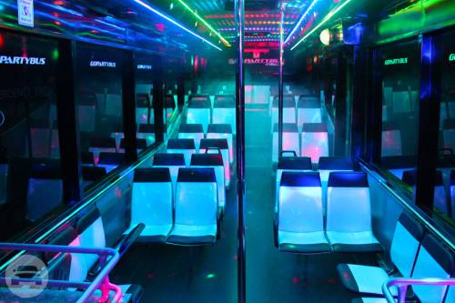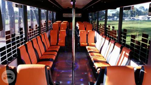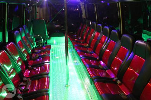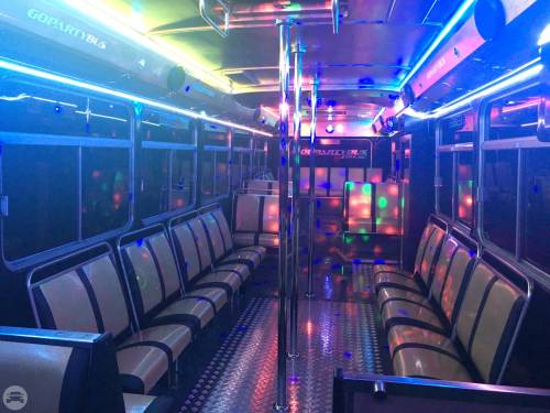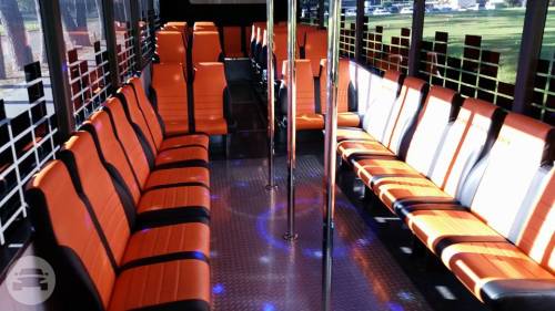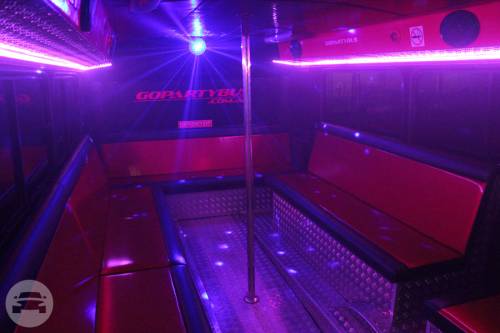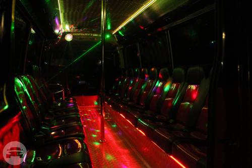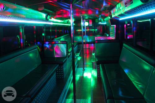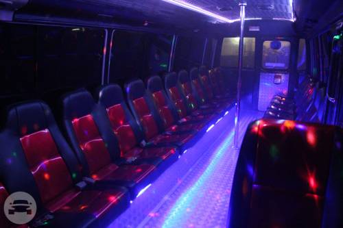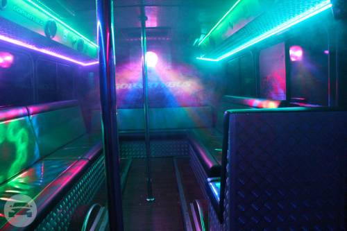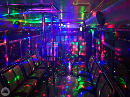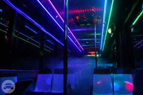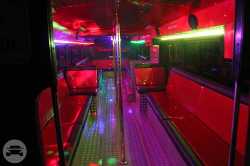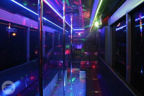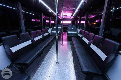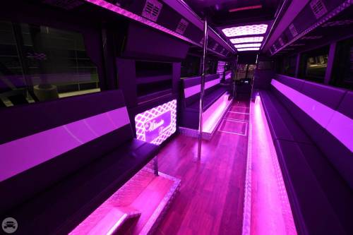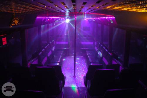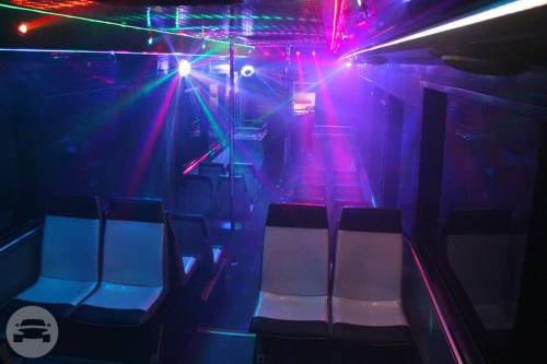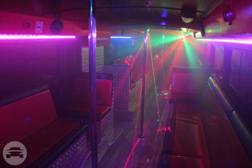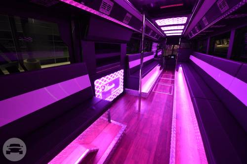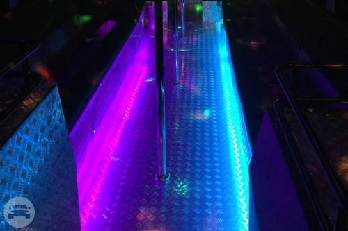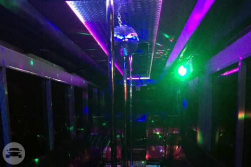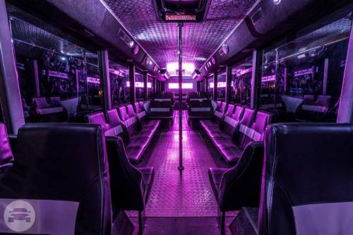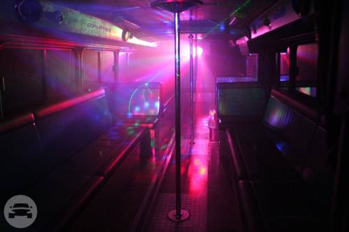 Air Conditioned Wheel chair accessible Pink and Purple themed interior DJ designed Mood lighting Fog machines 3 dance poles Massive Dance Floor area Custom seats Limo style seating 10 speakers 4 subwoofers Tv/DVD player Strobes 45 seats 50 person capacity